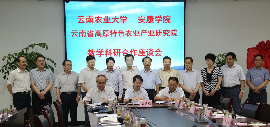 王国良、盛军和张郭宏分别代表安康学院、云南农业大学和云南省高原特色农业研究院签署了合作协议。