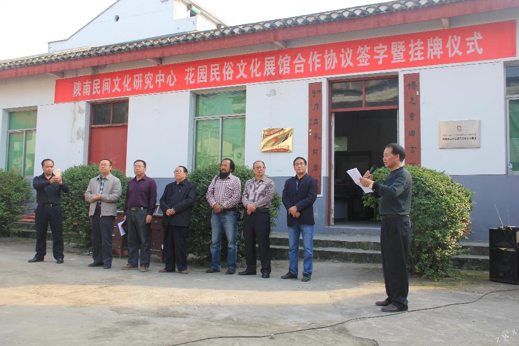 10月14日下午,安康学院陕南民间文化研究中心与安康市汉滨区花园民俗文化展馆合作协议签字暨挂牌仪式在花园民俗文化展馆顺利举行。陕南民间文化研究中心主任戴承元、安康学院中文系副主任梁卫华、汉滨区文化馆副馆长杜勤印、花园民俗文化馆馆长冉本藩、汉滨区老促会代表周明桥、金州收藏协会理事、安康收藏界大佬朱良友、汉滨区金少堂民俗馆馆长王金少、五里镇花园九年制学校王祖荣书记和刘宝星书记等参加了挂牌仪式,中文系2015级秘书学新生和部分教师全程参与了此次活动。