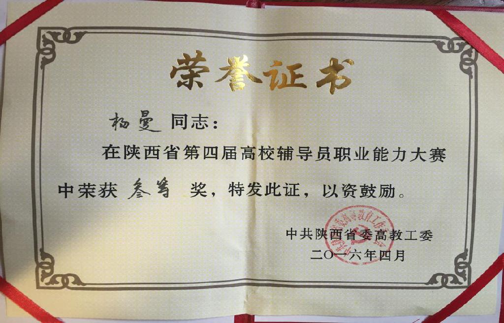 3月31日至4月1日,陕西省第四届高校辅导员职业能力大赛在西北大学举行,来自全省84所高校的127名辅导员参加了比赛。我校选拔的农生院辅导员杨曼和艺术学院辅导员艾蕾代表学校参赛,经过两天紧张激烈的比拼,最终双双荣获三等奖。