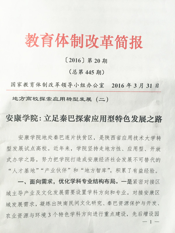 3月31日,国家教育体制改革领导小组办公室编发的《教育体制改革简报》([2016]第20期),刊发了题为《安康学院:立足秦巴探索应用型特色发展之路》的文章,从面向需求,优化学科专业结构布局;校企结合,深化应用型人才培养模式改革;专兼结合,建设满足应用型人才培养需要的教师队伍;校地合作,主动服务区域经济社会发展四个方面详细报道了我校在地方高校探索应用转型发展之路上取得的成绩与积累的经验,现将全文影印版分享给大家。