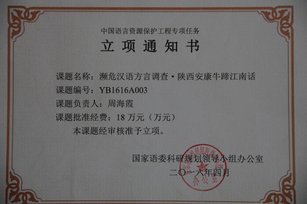 濒危汉语方言调查项目计划在全国立项100项,是“中国语言资源保护工程专项项目”中的重点项目,陕西省共计正式获批立项4项,“陕西安康牛蹄江南话”是其中的4项之一,也是陕南唯一获批立项的濒危汉语方言调查研究项目。“中国语言资源保护工程专项项目”是由中央财政设立拨款,由教育部和国家语委领导实施的一项重大语言文化类国家工程专项项目,是建国以来规模最大、重视程度最高的国家语言资源调查研究工程。其目的是利用现代化技术手段,全面调查我国当今语言状况,收集记录汉语方言、少数民族语言和口头文化的实态语料,进行科学整理和加工,建成大规模、可持续增长的多媒体语言资源库,并开展语言资源保护研究工作,全面提升我国语言资源保护和利用的水平,为传承中华优秀传统文化、促进民族团结、维护国家安全服务。