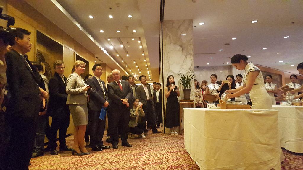 5月13日,2016丝博会暨第20届西洽会“一带一路”教育合作交流会开幕式在西安举行。作为本次大会的承办高校之一,我校承担交流会开幕式茶艺汇报演出工作。在开幕式现场茶艺表演中,学生们摆具恭请、叶嘉酬宾、孟臣沐淋、高山流水、分盛甘露、凤凰三点头、敬奉香茗……一系列茶道手法行云流水般从容施展,为嘉宾缔造了一场视觉、味觉、感觉三重享受的茶艺盛宴,完美地展现了我校学生过硬的专业素质以及缤纷多姿的社团风采。