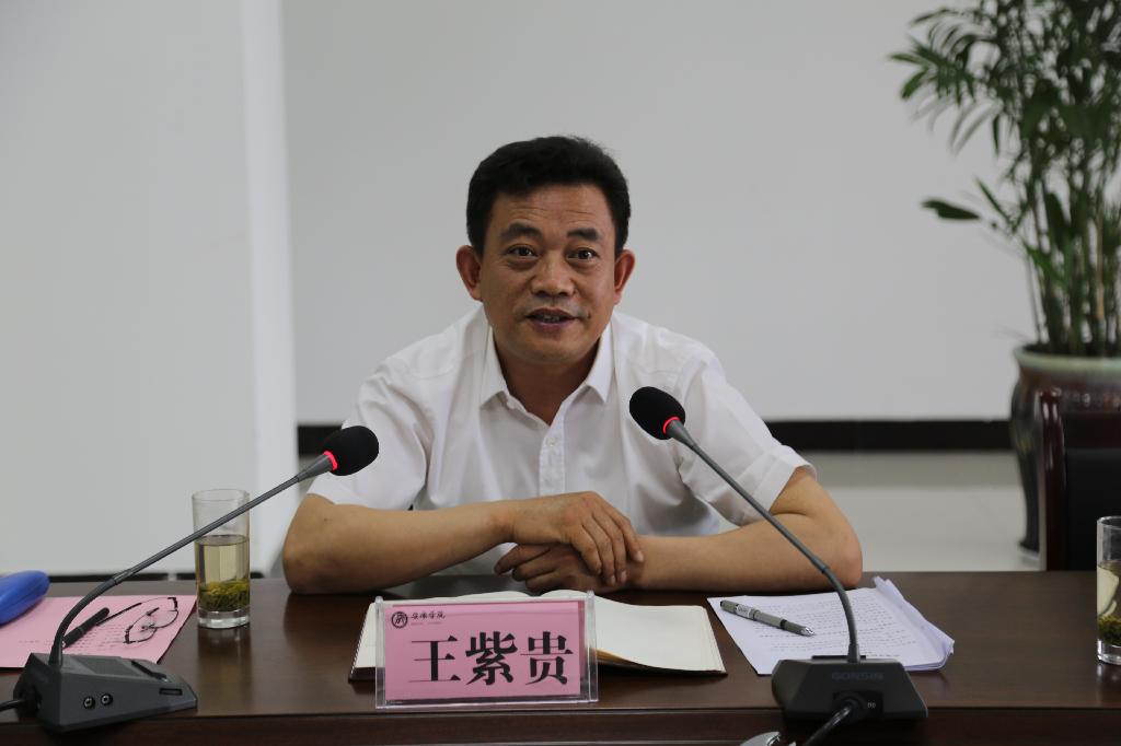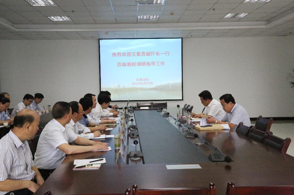 王国良首先代表学校对王紫贵一行的到来表示欢迎,并对学校的发展概况、升本以来取得的成绩及“十三五”的发展目标做了介绍说明。他讲到,自升本以来,我校在省委、省政府、省委高教工委、教育厅和高教局的正确领导下,紧密结合办学传统和自身发展实际情况,坚持“服务基础教育、服务‘三农’,服务区域经济社会发展”的办学宗旨,积极转变教育思想观念,不断明晰地方新建本科院校的发展思路,强化教学中心地位,积极探索应用型人才培养模式,大力改善办学条件,加快转型发展,全面提升办学质量,学校总体事业发展势头良好。2016年,是学校“十三五”的开局之年,也是学校全面深化改革,全面推进转型发展的关键之年。我校把加快转型发展,推进内涵建设,提高应用型人才培养质量作为学校未来发展的重要任务,将在今年进一步完善学校顶层设计,编制学校“十三五”事业发展总体规划和转型发展的具体规划,制定出时间表和路线图。