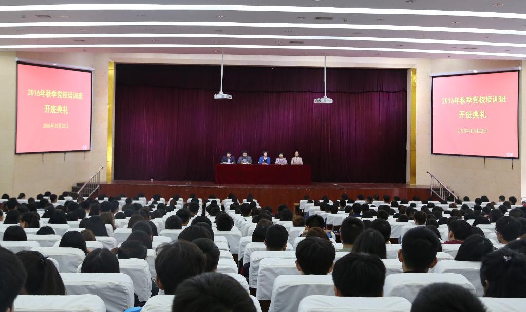 10月22日,学校党校2016年秋季培训班开班典礼在江南校区大礼堂举行,学校党委宣传部部长鲁延安,组织部副处级组织员车静,党校办公室主任韩晔,培训班班主任王瑜、陈均莹以及由各党支部推荐确定的620余名入党积极分子学员和170余名发展对象学员出席和参加了开班仪式,开班仪式由韩晔主持。