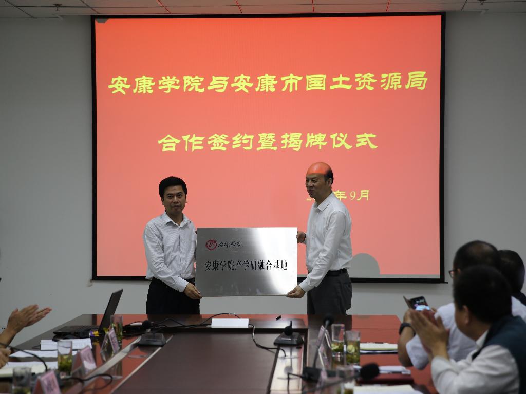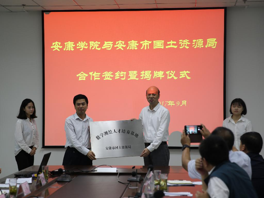 陈刚与廖坤波共同签署产学研合作协议,并为校地共建“秦巴国土资源利用与环境保护协同创新中心”揭牌;陈刚代表安康学院为安康市国土资源局授予“产学研融合基地”牌匾,廖坤波代表安康市国土资源局为安康学院授予“安康市数字测绘人才培训基地”牌匾。