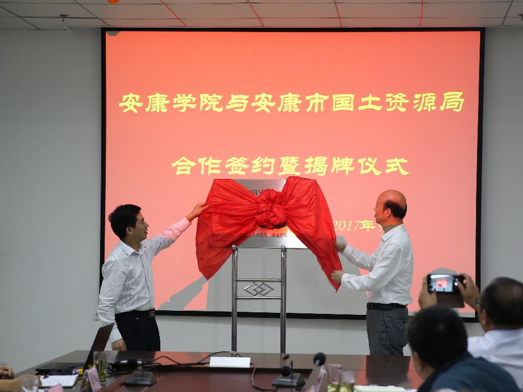 9月6日上午,安康学院与安康市国土资源局产学研合作签约暨揭牌仪式在江北校区逸夫科技楼九楼会议室举行。市国土资源局局长廖坤波,副局长王福祥、黄自新,市地质灾害防治办公室主任华军,市土地统征中心副主任成小平、市土地整理中心主任党晓龙及市移民搬迁办综合科科长刘年喜等各科室负责人一行17人出席签约暨揭牌仪式。我校校长陈刚、副校长向纪明,相关职能部门负责人及师生代表参加了本次签约仪式。签约仪式由向纪明主持。