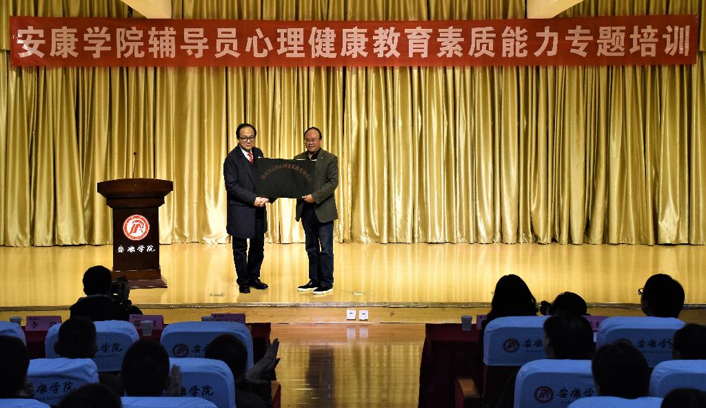 11月15日下午,陕西高校心理素质教育研究会常务理事单位授牌仪式暨安康学院辅导员心理健康教育素质能力专题培训会在江北校区1401演艺厅成功举办。陕西高校心理素质教育研究会会长、教育部国家精品课程心理学评审专家郑林科教授、我校党委副书记杨行玉出席会议。学工部负责人、心理健康教育中心教师、辅导员、班级心理委员以及来自安康职业技术学院学工人员共计200余人参加了本次培训会。会议由学工部部长李岩主持。