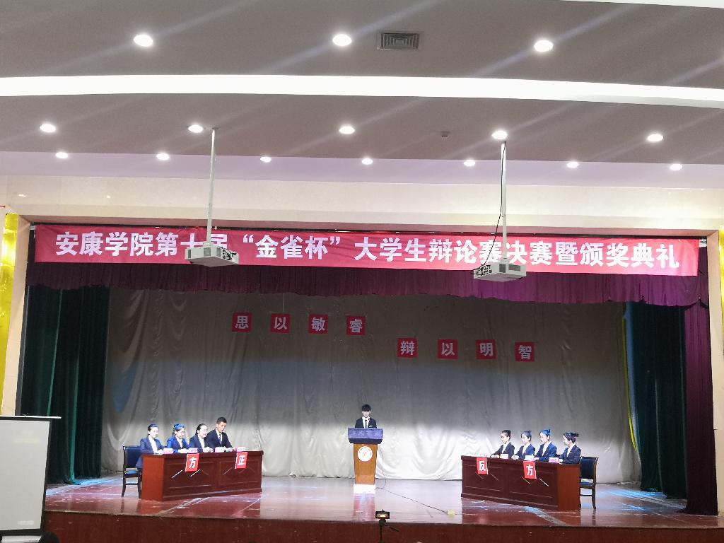 为提高我校大学生语言表达和逻辑思辨能力,培养青年学生的创新意识和团队精神,推进我校校风、学风建设,营造明理思辨的大学文化氛围,由校团委、教务处联合举办的安康学院第十届“金雀杯”大学生辩论赛经过半个多月的角逐,于11月16日晚在江南校区大礼堂迎来了决赛,学校党委副书记胡波莅临决赛现场并出席了颁奖典礼。党政办副主任周云、组织部副处级组织员车静、统战部副部长韩晔、学工部副部长黄娟、教务处副处长付争方、招就处副处长常权记、思政教研部副主任吴亚娥等担任决赛评委。共计500余名师生参加了本次活动。