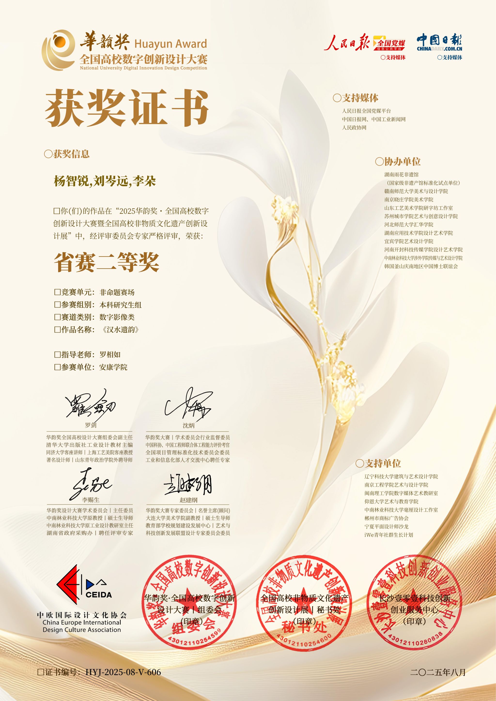 近日,“华韵奖·全国高校数字创新设计大赛”省级赛区评选结果揭晓,我校文传学院网络与新媒体专业学生团队创作的短视频作品《汉水遗韵》从全国500余所高校、3000余件参赛作品中脱颖而出,荣获省赛二等奖。该作品此前已荣获“华文奖”全国大学生文化创新·文旅创作大赛特等奖,此次再次获权威赛事认可,充分彰显了文传学院在文化传承与数字创新融合教育方面的显著成效。