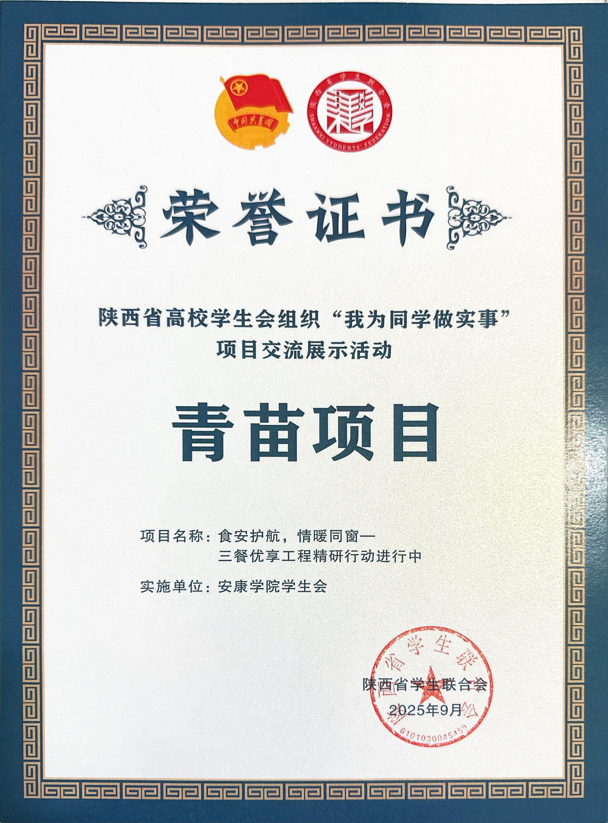 近日,由共青团陕西省委、陕西省学生联合会主办的2024—2025学年度陕西省高校学生会“我为同学做实事” 项目交流展示活动落幕。我校申报的“食安护航,情暖同窗——三餐优享工程精研行动进行中”项目,在全省47所高校的110个服务项目中突围,获评“青苗项目”。