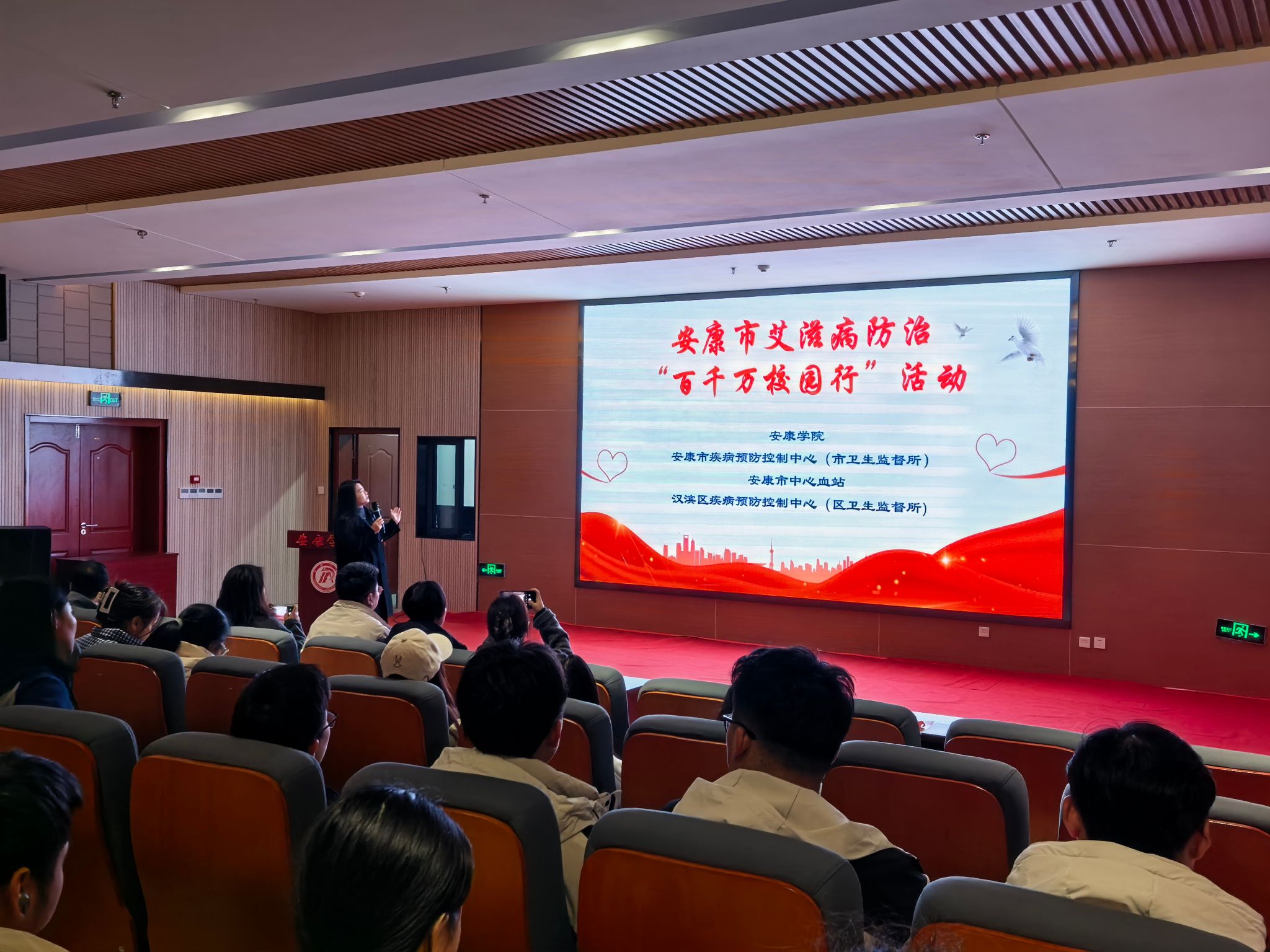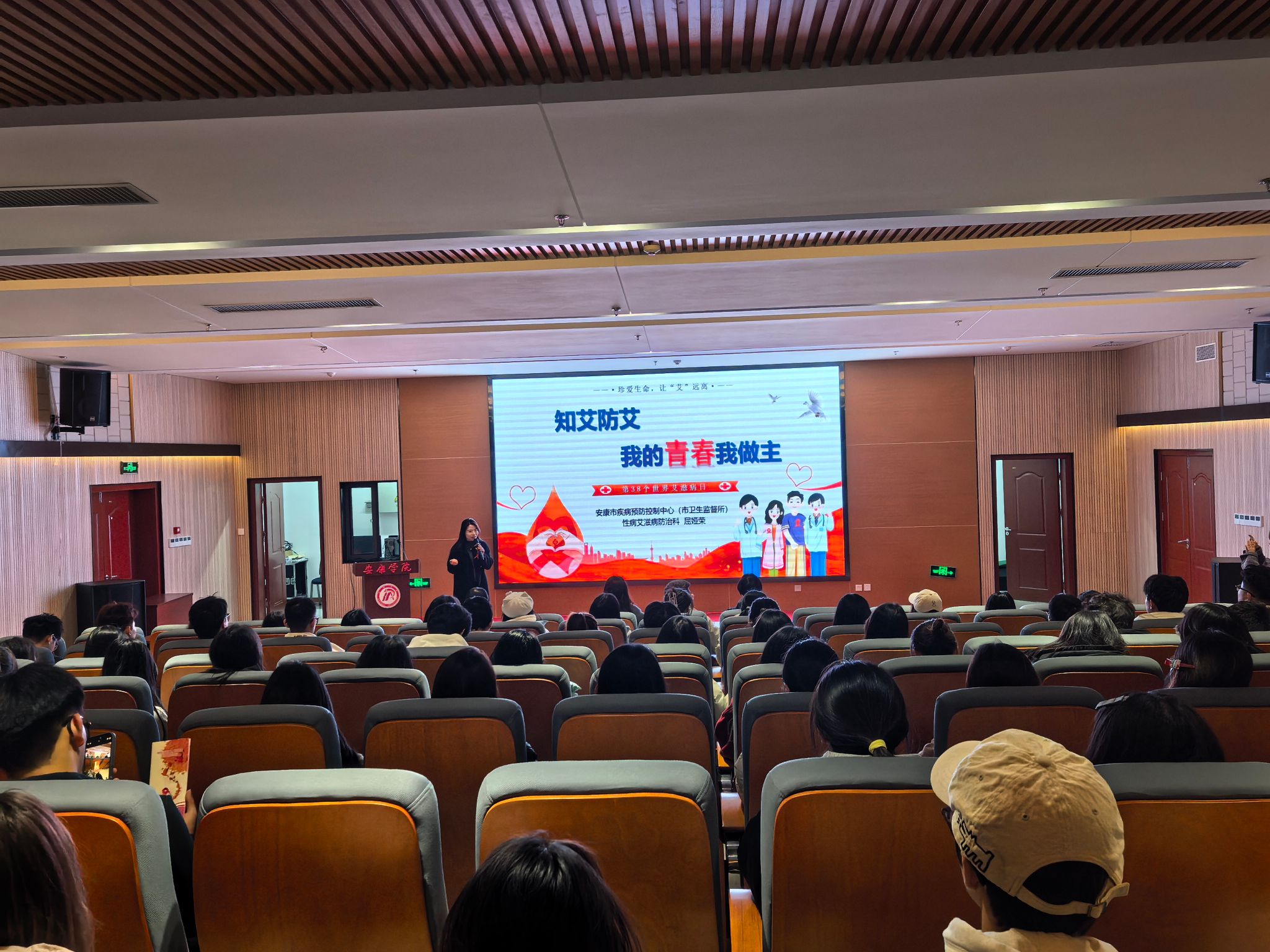 11月25日,江北校区学生活动小广场率先拉开活动序幕。“以爱防‘艾’,医路相行”主题团日活动气氛热烈,医学院志愿者们化身防艾知识传播使者,与同学们积极交流防艾见解。当日下午,江北图书馆报告厅内座无虚席,安康市疾控中心艾滋病科科长屈娅荣以“知爱防艾 我的青春我做主”为题带来一场精彩讲座。她结合真实案例与详细数据,深入浅出地阐释艾滋病的传播途径、严重危害及科学预防措施,现场互动频繁,学生踊跃提问,收获颇丰。活动期间,校医疗中心医护人员及志愿者还通过设置宣传展板、悬挂横幅、播放宣传视频、专人讲解及发放防艾宣传品、手册、红丝带和计生用品等多元形式,开展全方位、立体式防艾知识宣教。