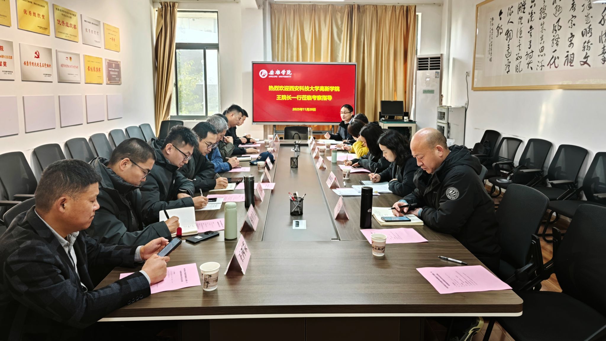 崔晓明代表学校对王福豹副院长一行表示热烈欢迎,并简要介绍了我校近年来建设发展情况。她表示,西安科技大学高新学院在智慧能源、智能建造等方面拥有丰富的产业资源和产学研合作经验,此次交流为两校及相关企业搭建了良好合作平台,希望双方找准合作切入点,实现资源共享、优势互补、互利共赢。