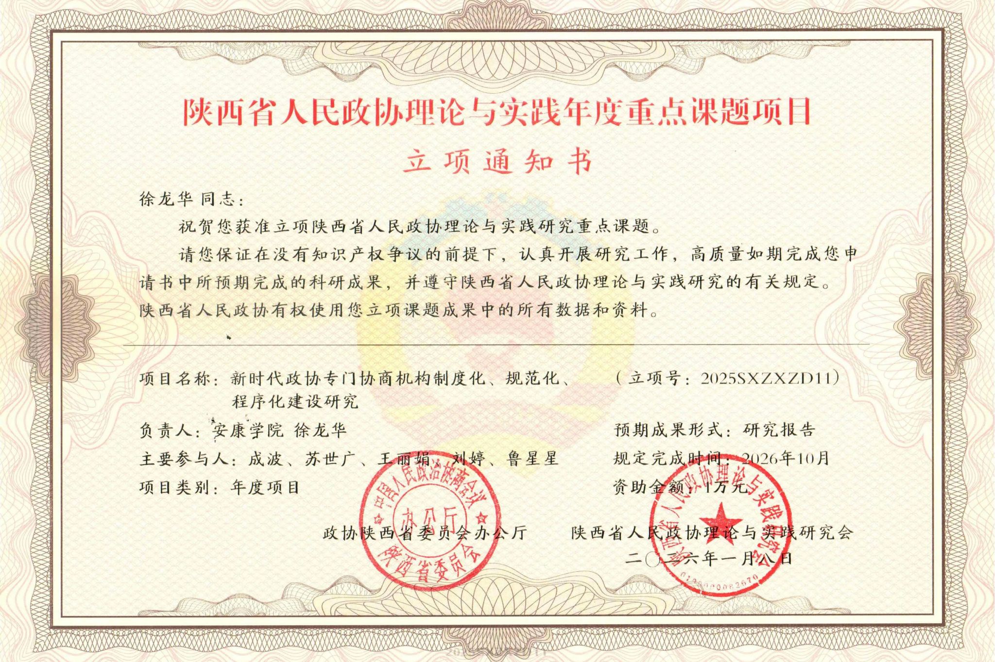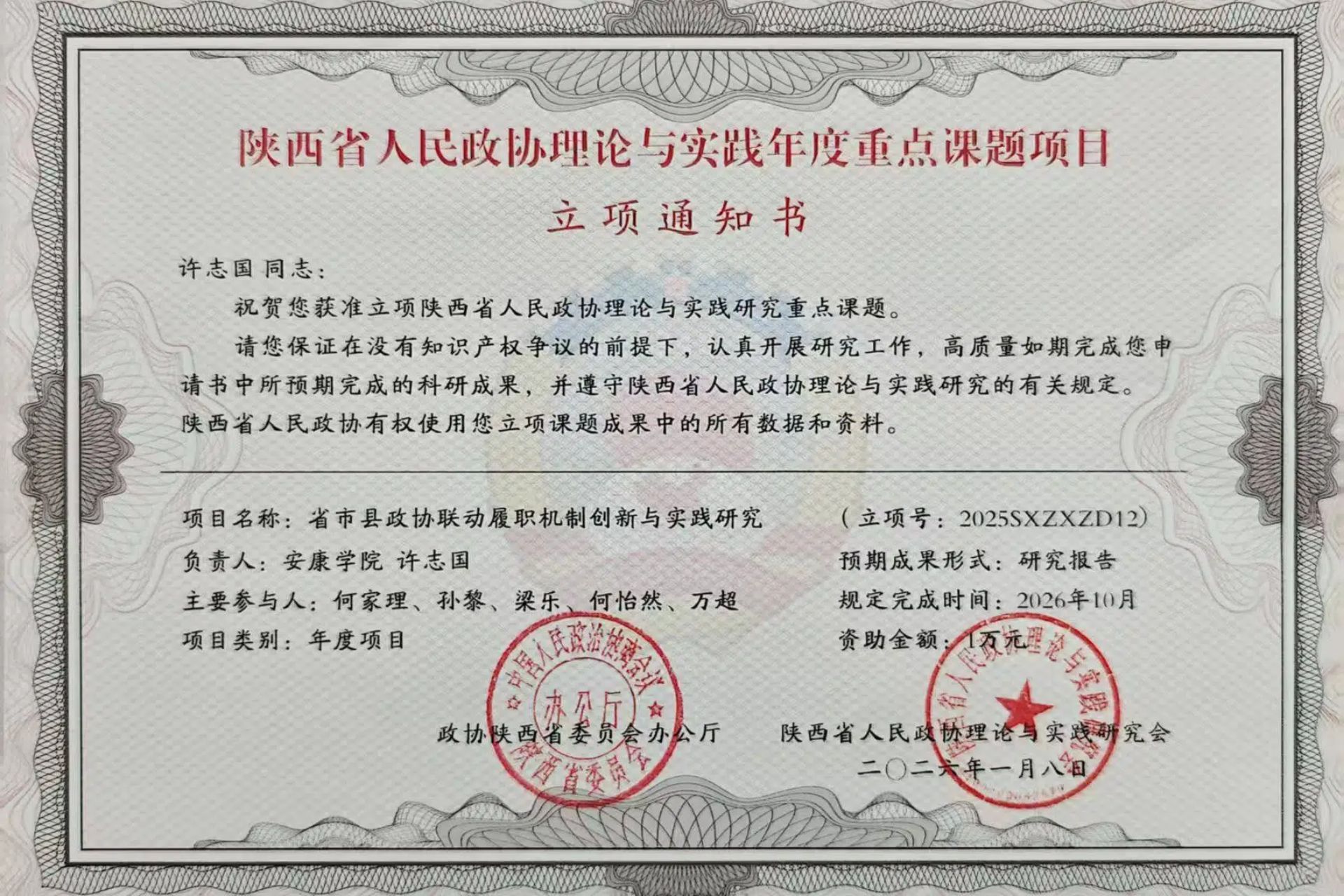 近日,我校陕西省人民政协理论与实践研究基地组织申报的《省市县政协联动履职机制创新与实践研究》与《新时代政协专门协商机构制度化、规范化、程序化建设研究》两项课题,成功获批2026年度陕西省人民政协理论与实践重点课题项目,标志着基地在人民政协理论研究领域取得新的突破。