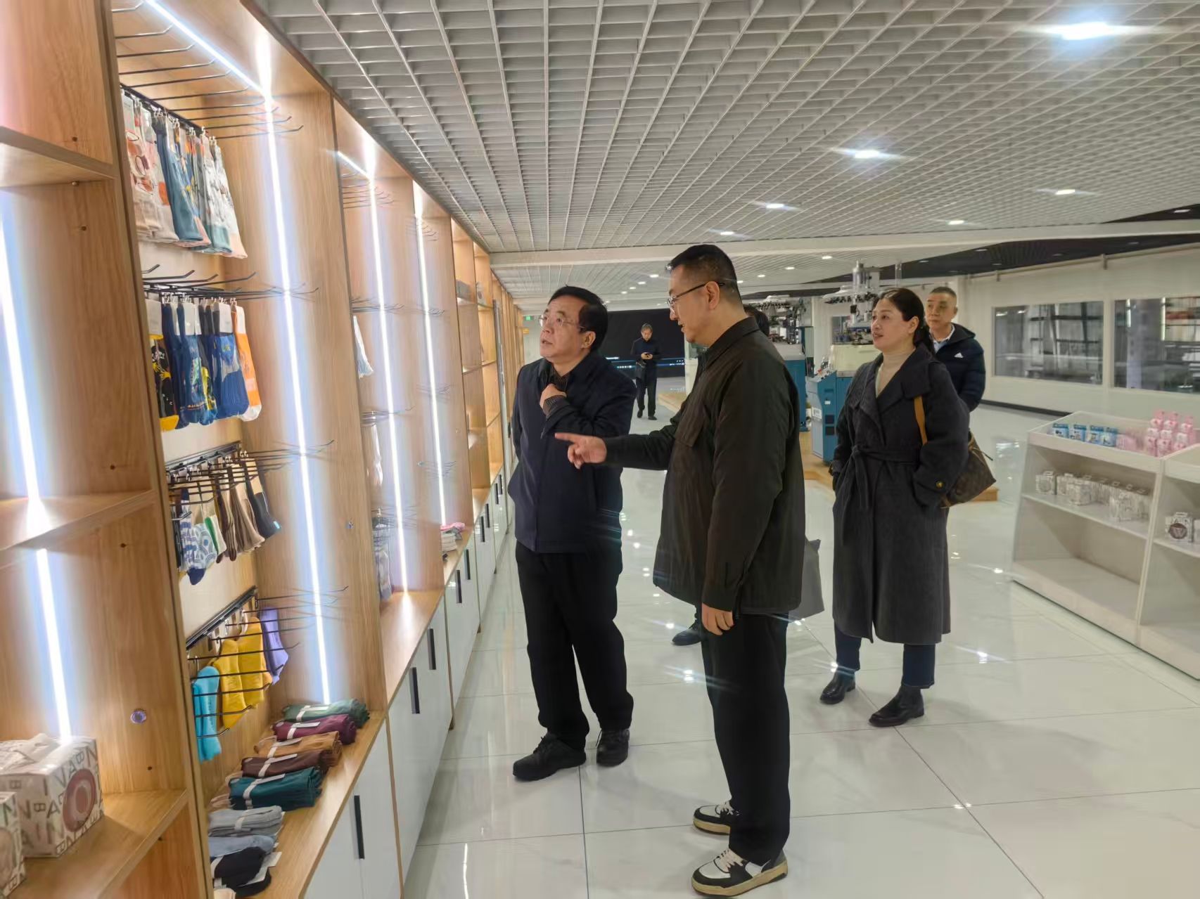 在柏润集团外联部部长王亮陪同下,余劲一行深入考察了生产基地的业务布局、仓储及智能制造车间。王亮介绍,柏润集团以贸易为基石,扎根长三角,已发展成为以OEM/ODM代工为核心、兼营自主品牌的外向型企业,近80%产品销往欧美市场,并具备高端制袜设备自主研发制造能力,依托数字化管理体系实现了高效生产。