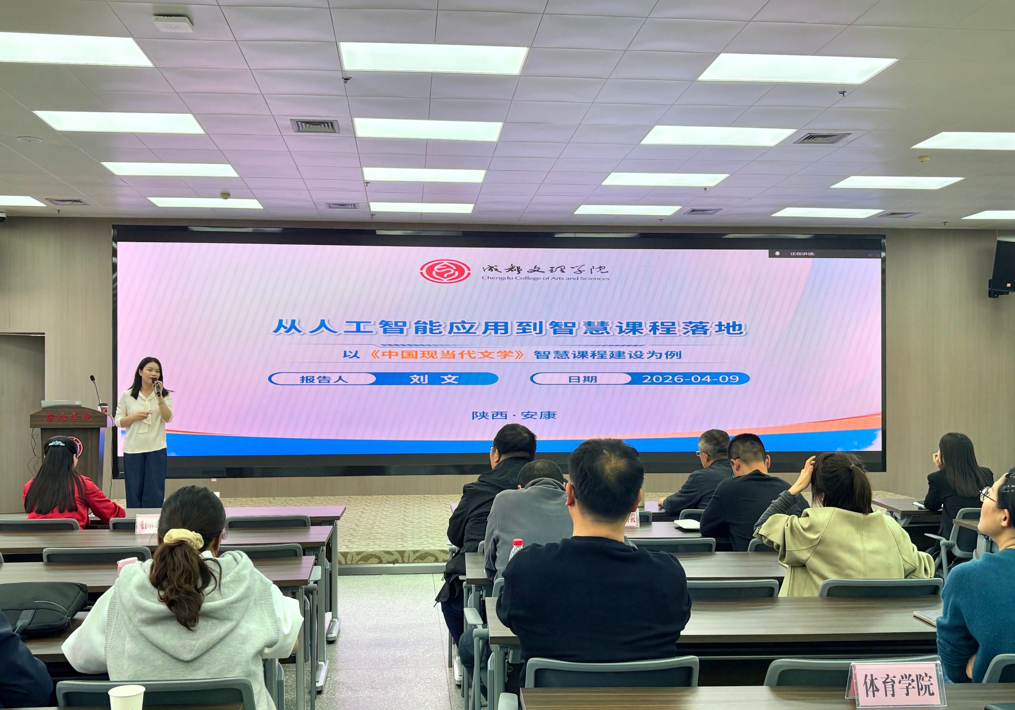 成都文理学院刘文副教授围绕《从人工智能应用到智慧课程落地:高校教师教学创新与竞赛提升的实践路径》主题分享经验。她阐释了智慧课程建设的“道-法-术-器”框架,结合《中国现当代文学》课程实例,介绍了AI教学平台应用、混合式教学模式创新等核心内容,拆解智慧课程落地流程,并分享了成果转化为竞赛优势的方法,为教师备赛指明方向。