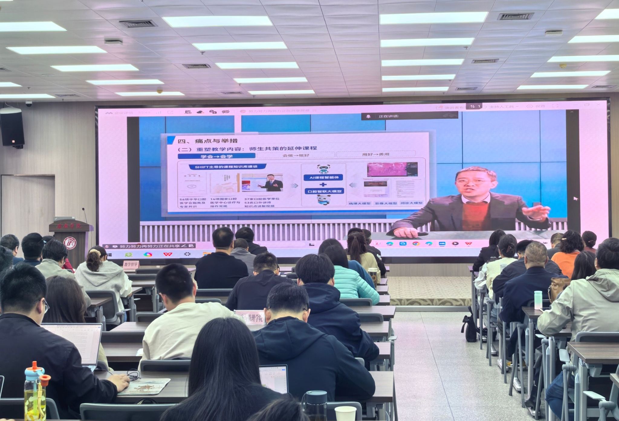 培训邀请四川大学李春洁教授作专题分享,她以《SHIFT模式与AI智慧课程建设为核心的教学创新》为题,结合《口腔颌面外科学》课程实践,拆解了AI赋能教学的具体路径。该课程通过构建SHIFT体系、革新教学方法、创新案例教学等举措,引导学生提升综合能力,既为日常教学提供了创新思路,也为教师备赛提供了实用参考范式。