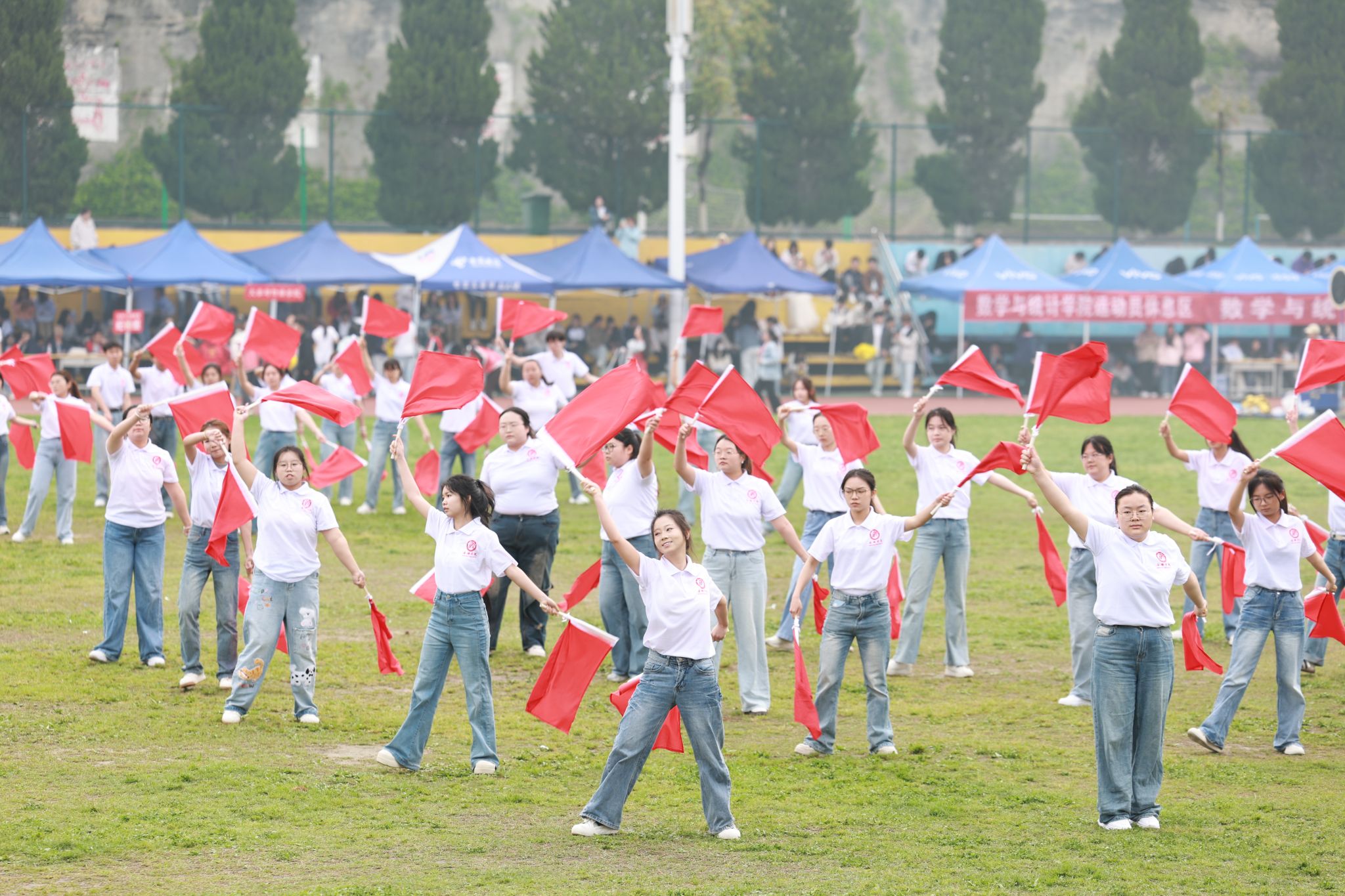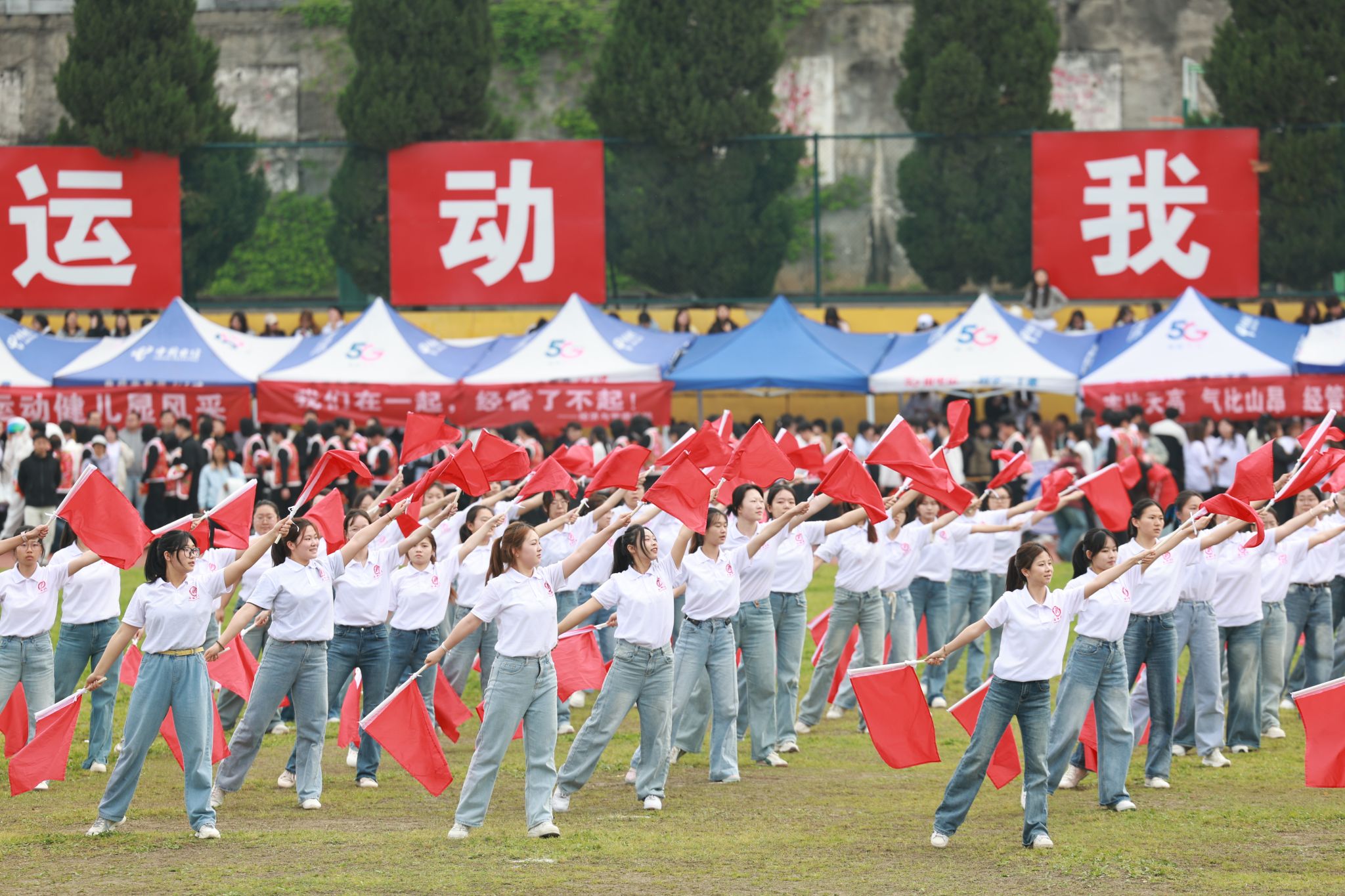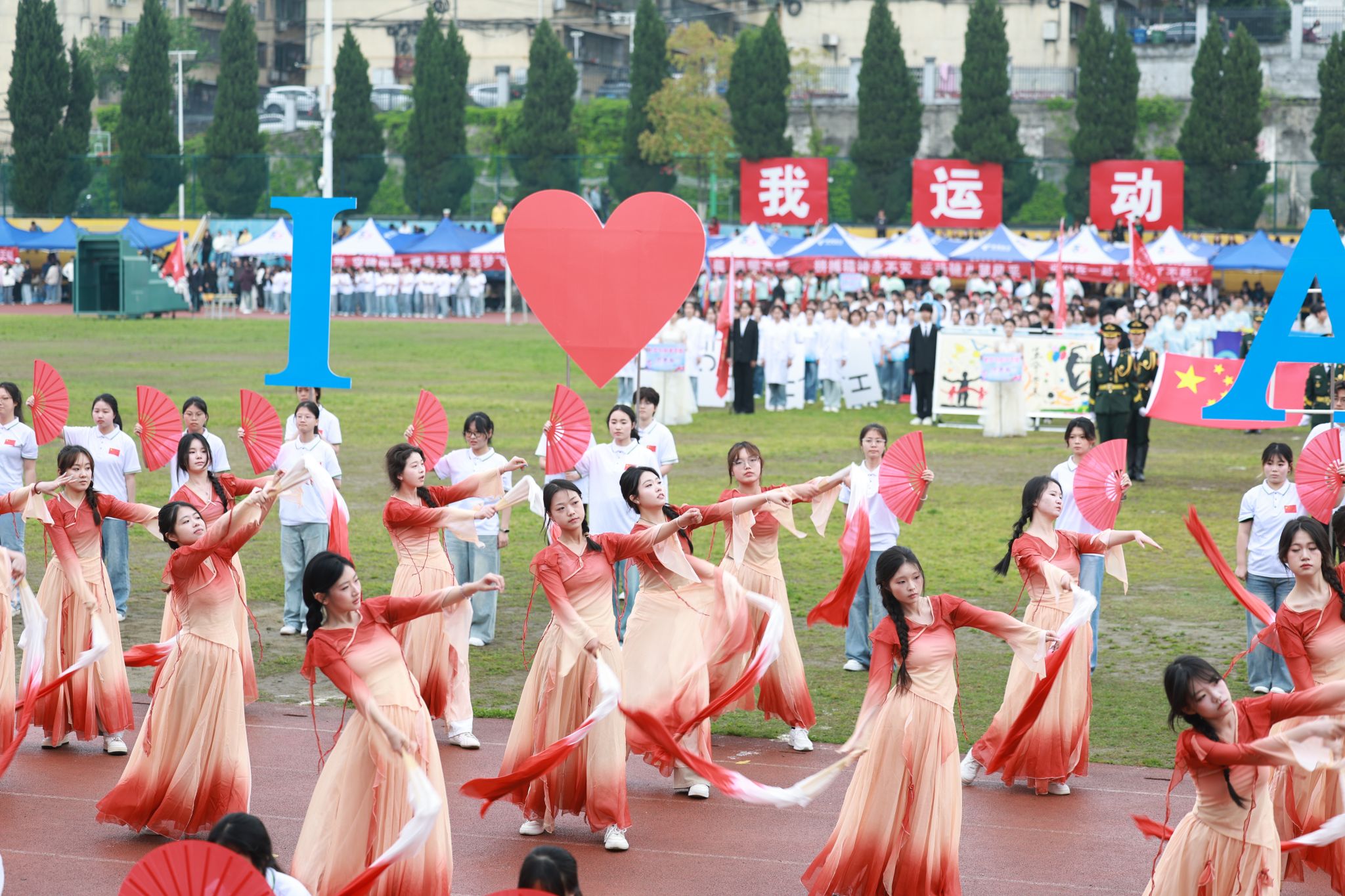 伴随着激昂雄壮的国歌声,鲜艳的五星红旗冉冉升起,全体师生面向国旗肃立,高唱国歌,以庄严仪式拉开运动华章序幕。