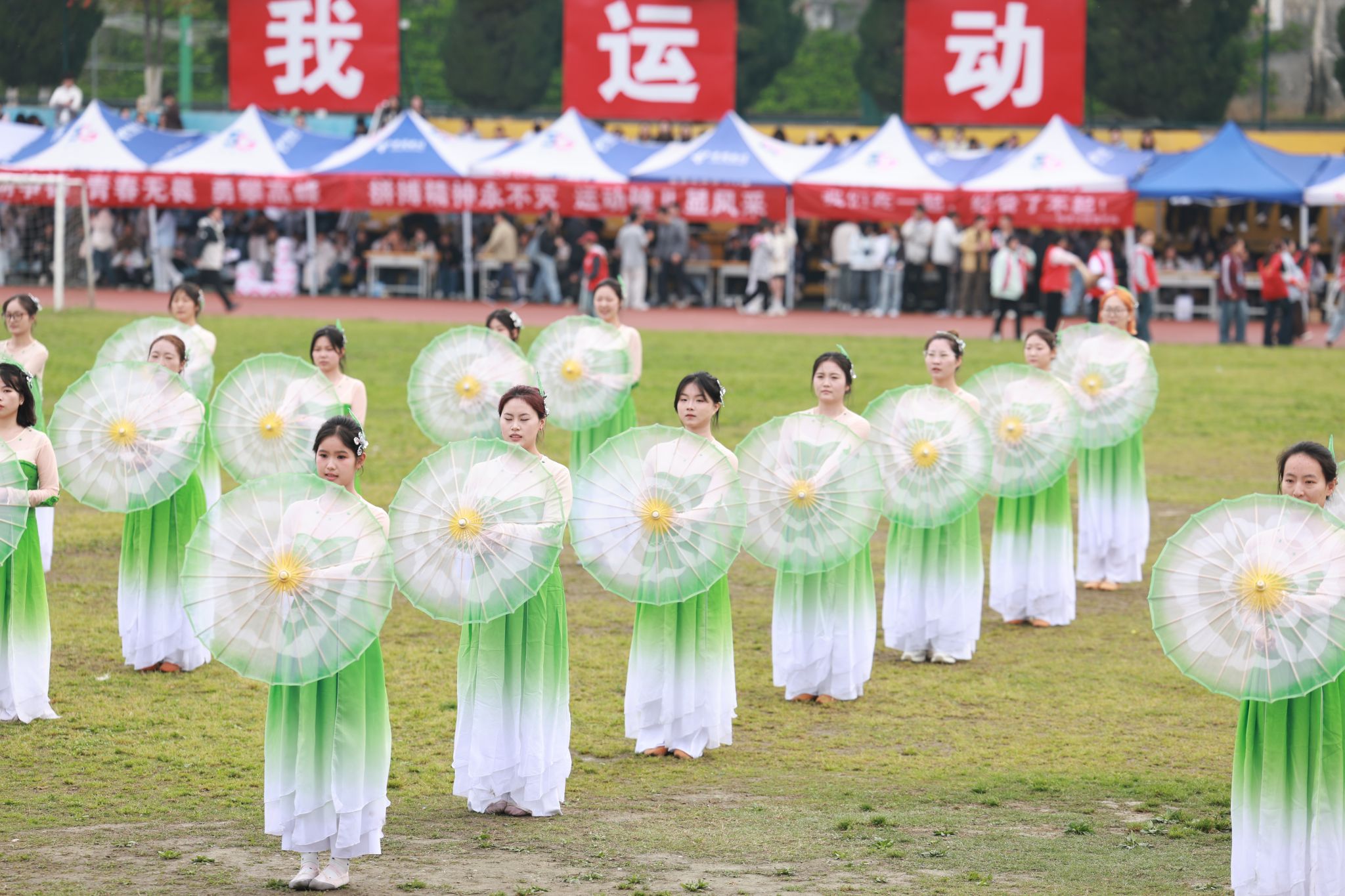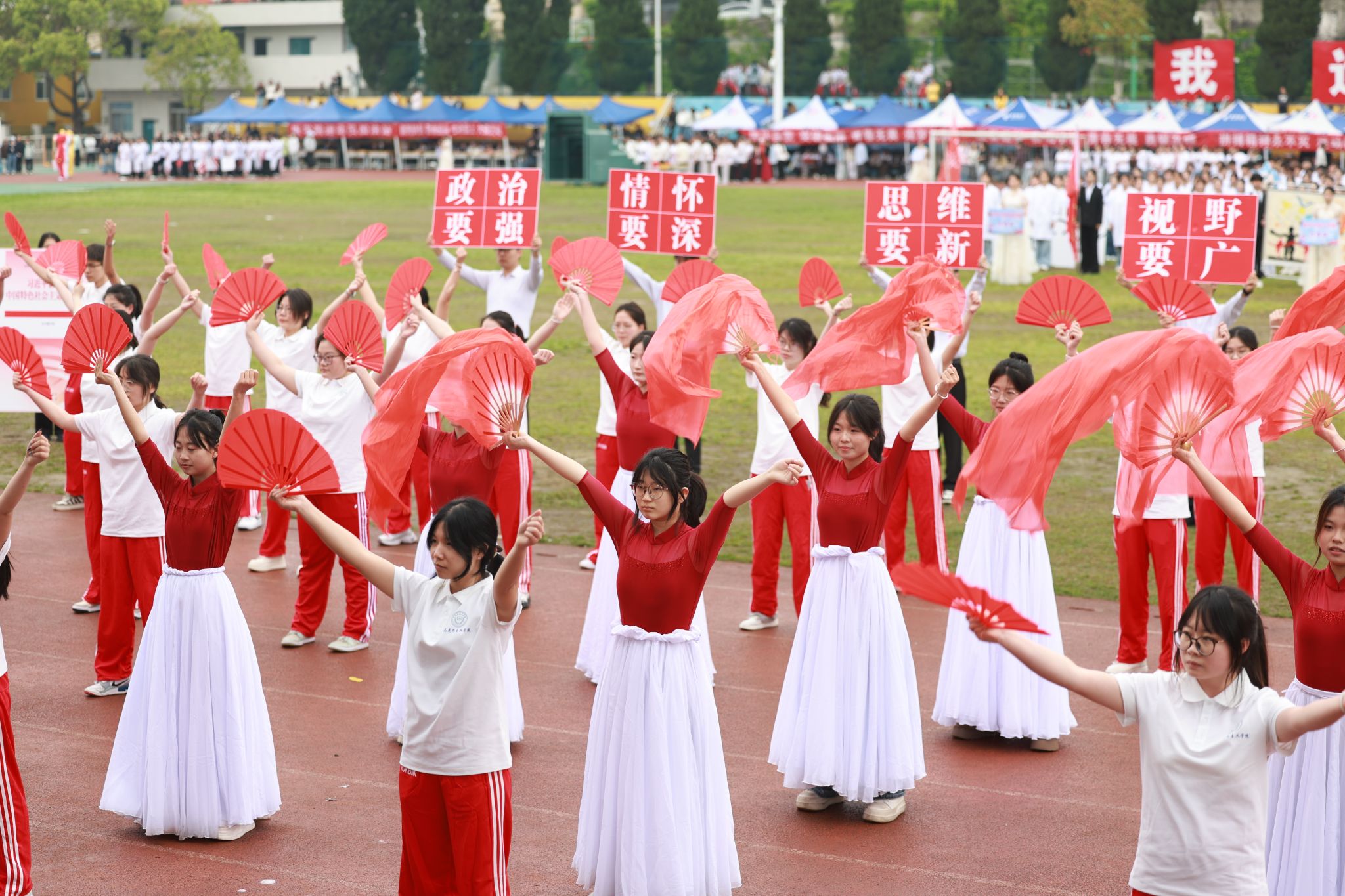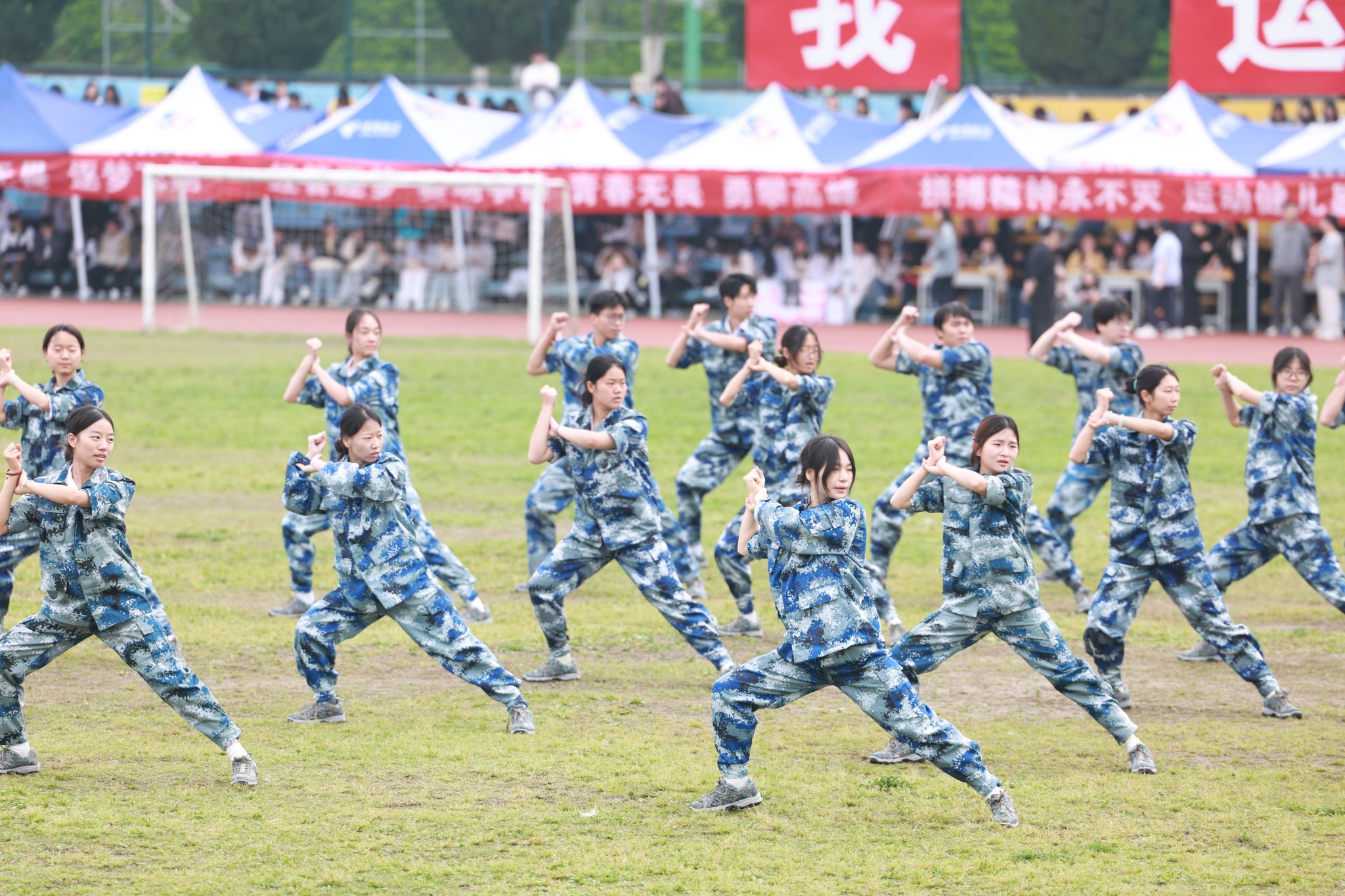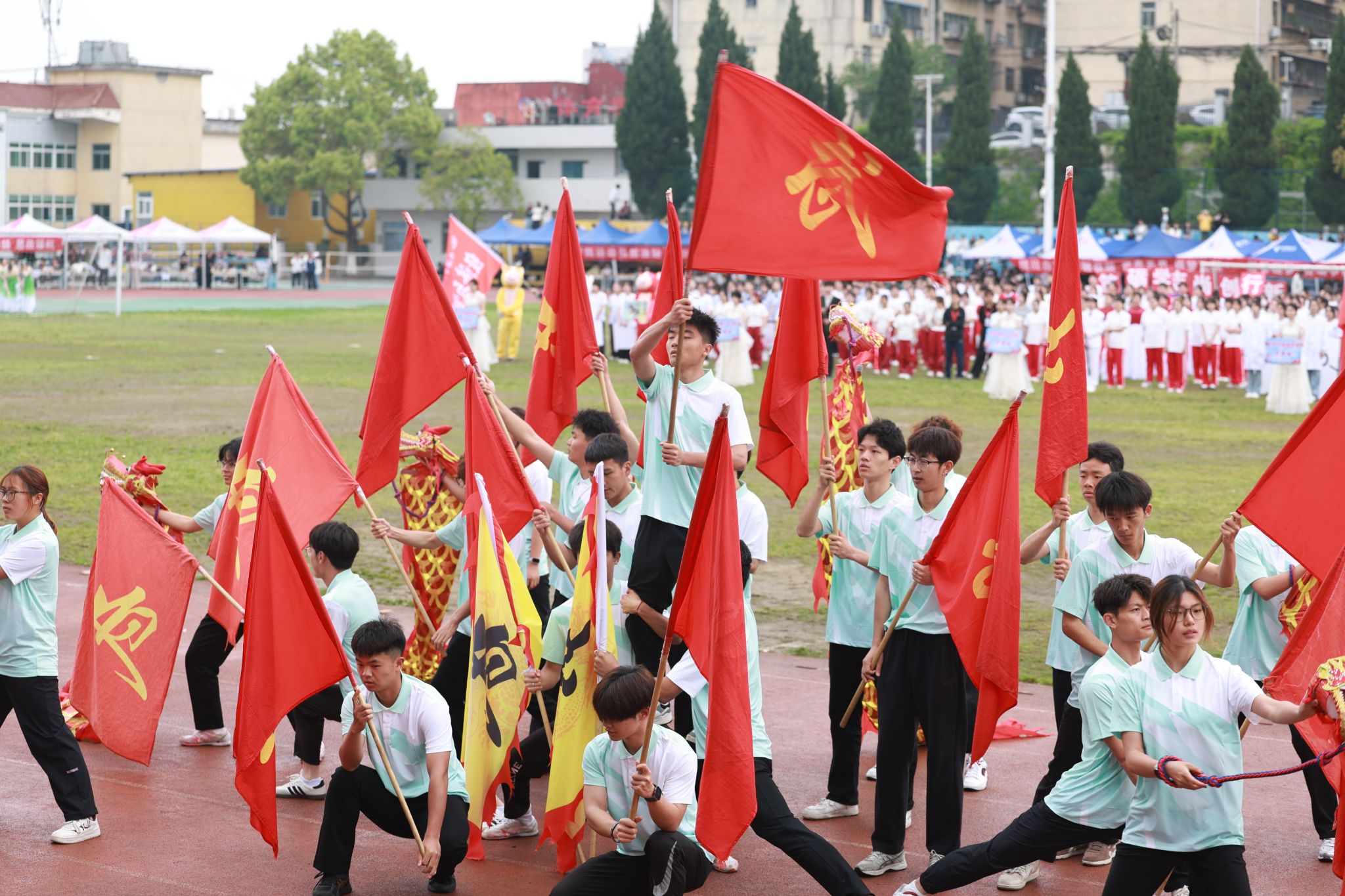 13个师生方阵精神抖擞、步伐矫健,嘹亮的口号此起彼伏,尽显团结拼搏、昂扬向上的精神风貌。方阵过后,特色表演轮番登场:旗舞队挥旗舒展、红绸翻飞,少年意气随鼓点激荡;茉莉花舞者身姿温婉、雅致灵动,传统韵味与青春活力在旋转中交融;擒敌拳方队刚劲出拳、虎虎生风,一招一式尽展学子坚毅品格。多元创意表演将体育精神与艺术之美深度融合,绘就出一幅朝气蓬勃、奋进向上的青春画卷。