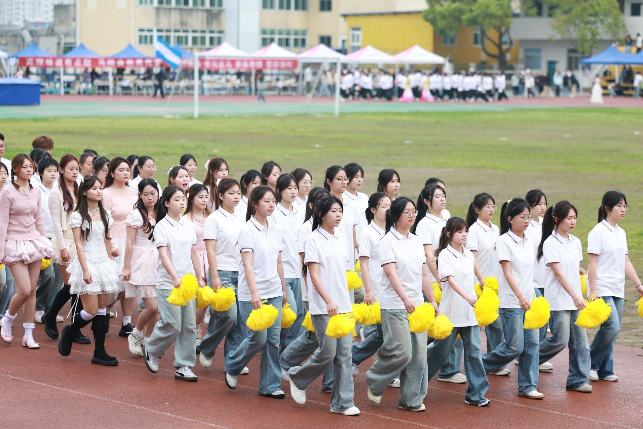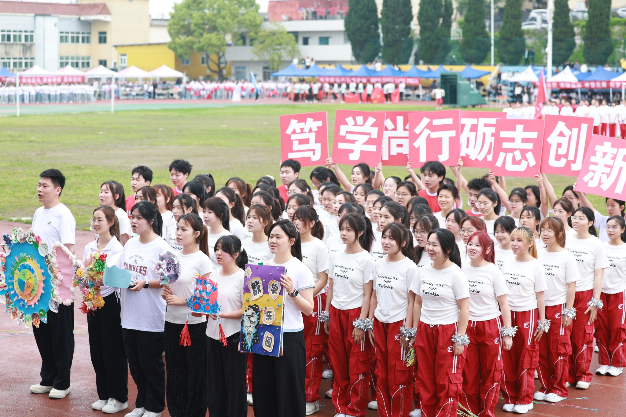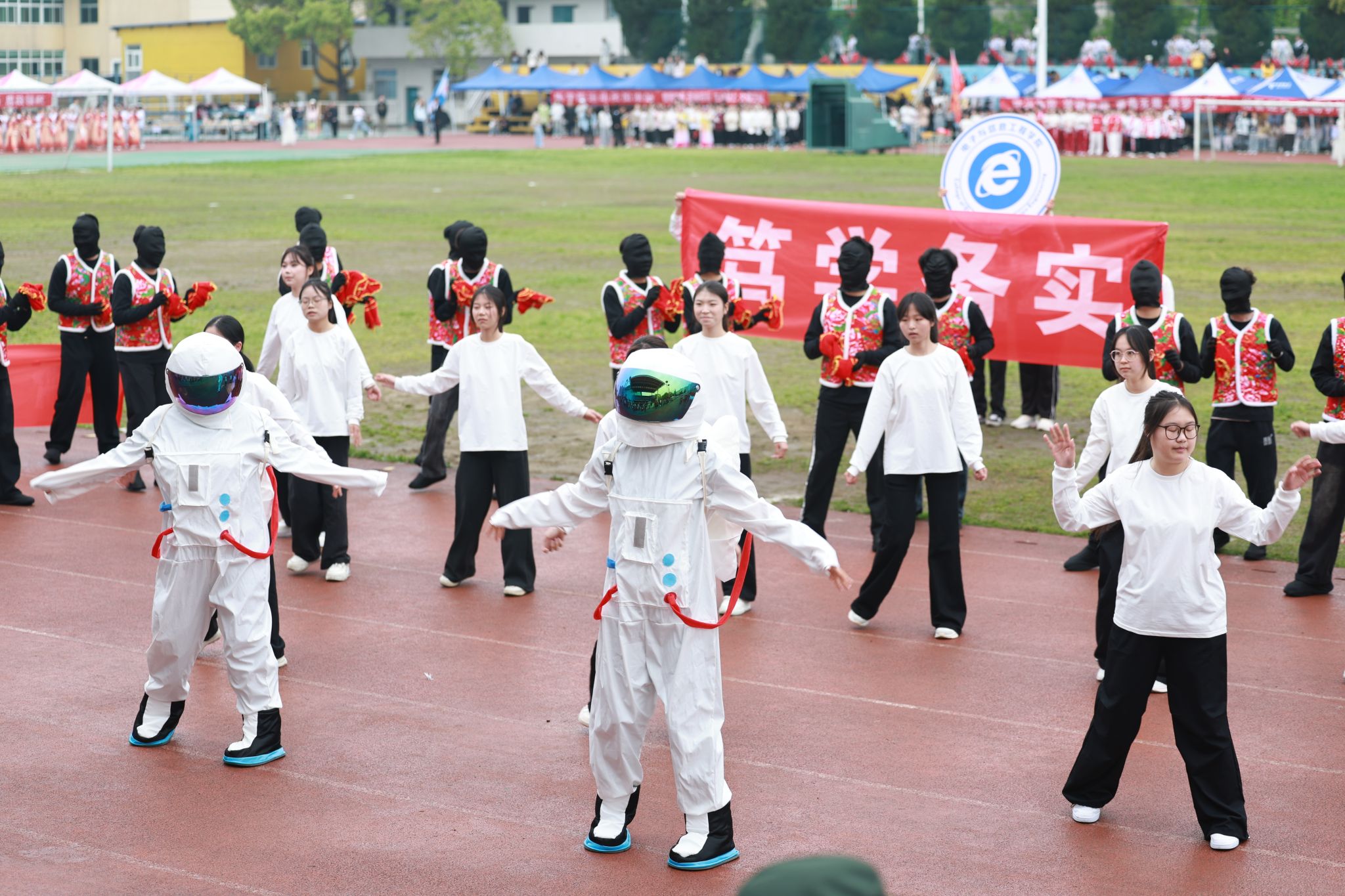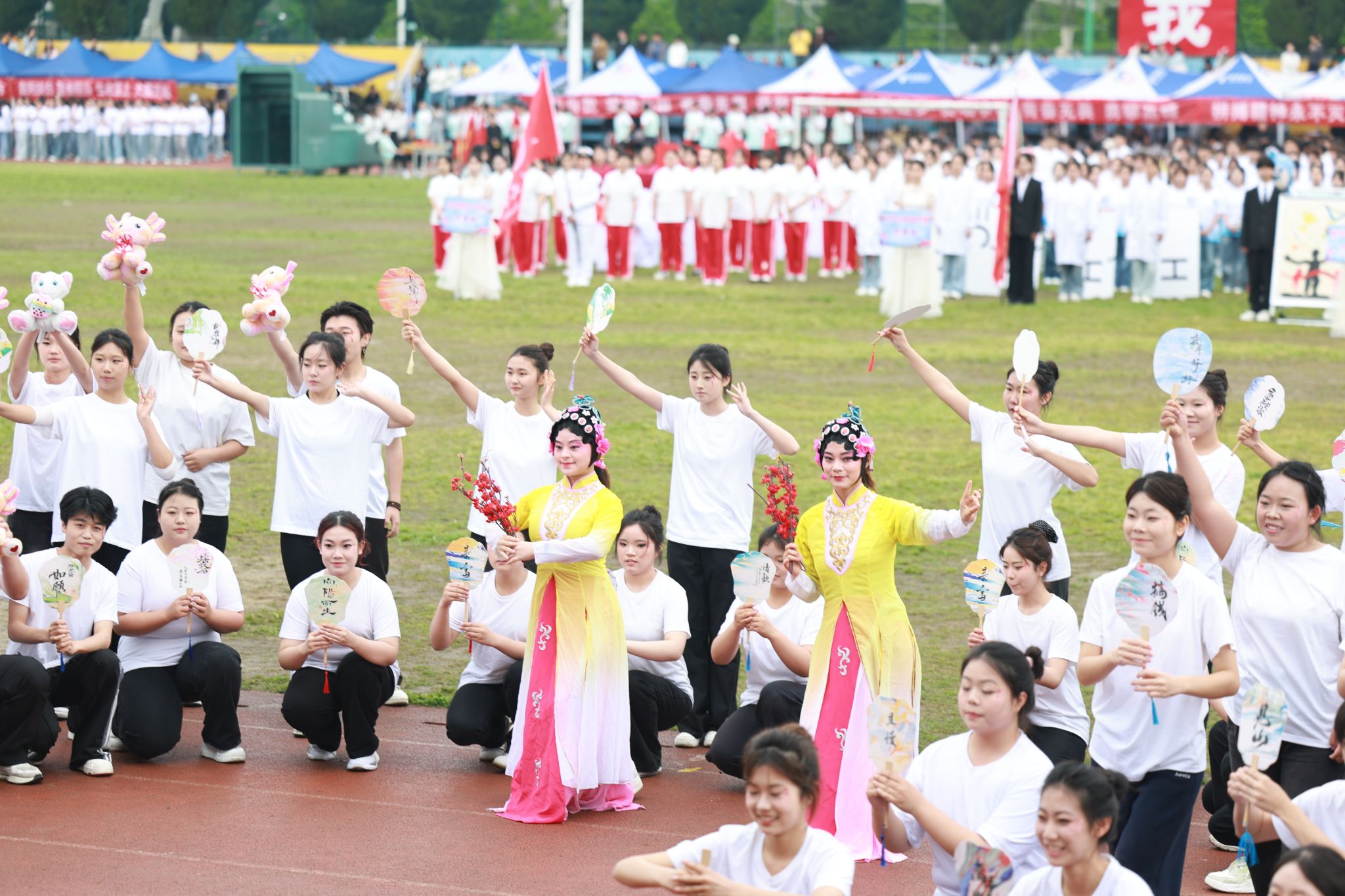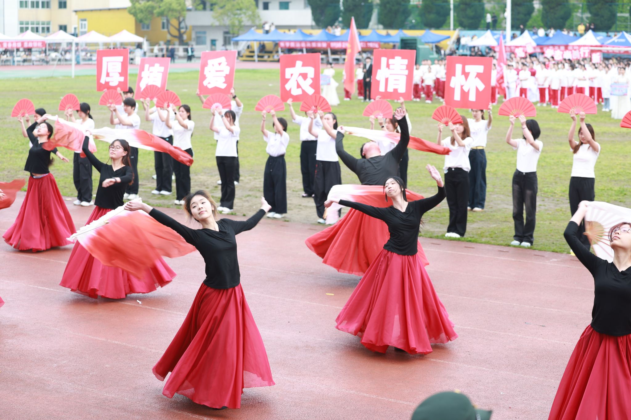 13个师生方阵精神抖擞、步伐矫健,嘹亮的口号此起彼伏,尽显团结拼搏、昂扬向上的精神风貌。方阵过后,特色表演轮番登场:旗舞队挥旗舒展、红绸翻飞,少年意气随鼓点激荡;茉莉花舞者身姿温婉、雅致灵动,传统韵味与青春活力在旋转中交融;擒敌拳方队刚劲出拳、虎虎生风,一招一式尽展学子坚毅品格。多元创意表演将体育精神与艺术之美深度融合,绘就出一幅朝气蓬勃、奋进向上的青春画卷。