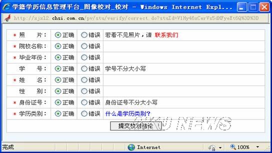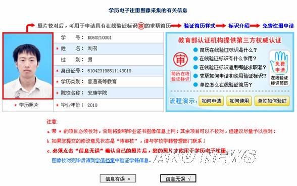 请认真核对本人的图像信息是否是本人图像;学号、姓名、身份证号、院校名称、毕业年份每项信息是否正确(毕业年份应为2010年)。核对所有信息,完全正确无误的请单击“信息无误”确认;对于某项信息有误,必须单击“信息有误”,进一步填写勘误表并提交