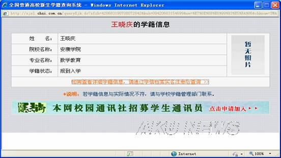 5.此次2009级新生查询的学籍注册信息是2009级学生毕业时学历证书电子注册信息的唯一依据。如学生不按时查询,出现的学籍信息错误,由学生本人承担责任。