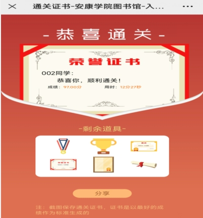 3.依次学习完六个章节的内容且闯关成功后,由图书馆在24小时内开通“校园卡”的“图书借阅”权限。