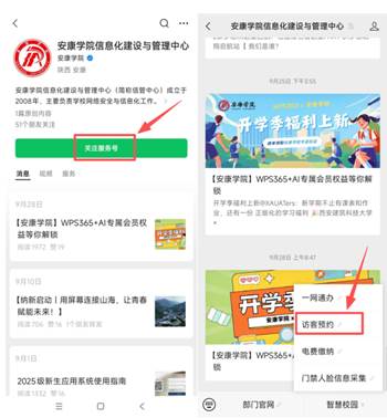 1.外来访客进校需提前预约,扫描下方二维码,登录访客系统;或者关注“安康学院信息化建设与管理中心”公众号,点击访客预约进入系统。